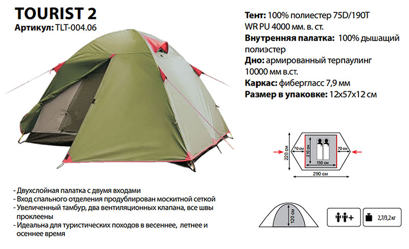 | Ткань тента | 100% полиестер 75D/190T WR PU 4000 мм в ст |